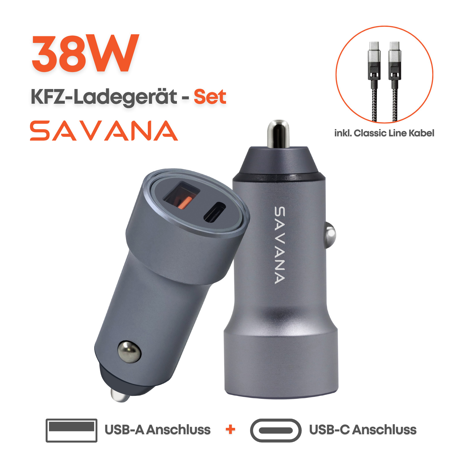 SAVANA Auto Schnell Ladegerät 38W USB-A & USB-C + 1.2m USB-C Kabel PD/QC 3.0 KFZ