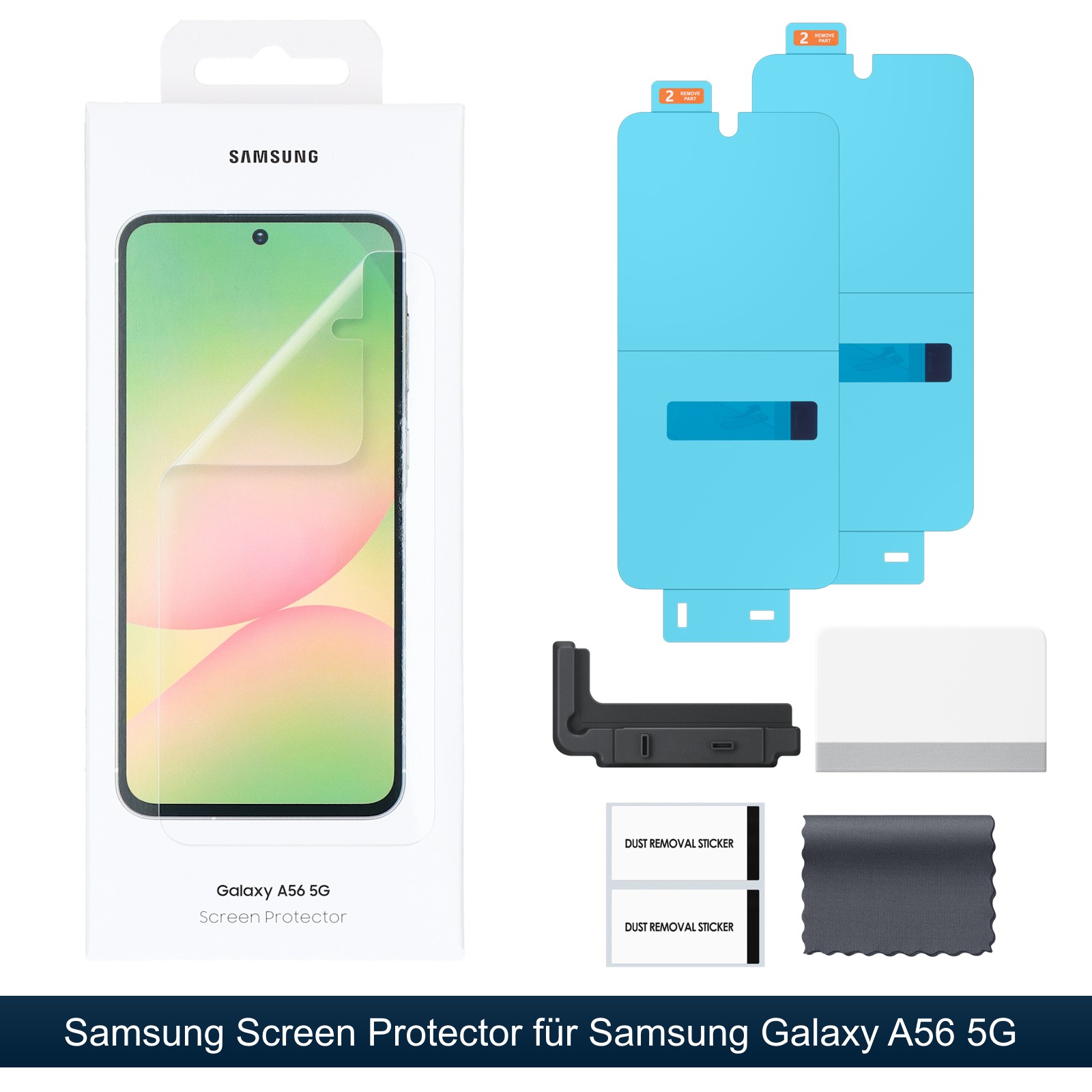 Zwei Schutzfolien im Set für doppelten Vorrat. Original Samsung Displayschutz Folie Screen Protector 2 Stk. für Galaxy A56 5G. Schützt dein Galaxy A56 5G vor Kratzern und kleinen Beschädigungen – inklusive Applikator und zwei Folien für optimale Sicht und Touch Empfindlichkeit.
