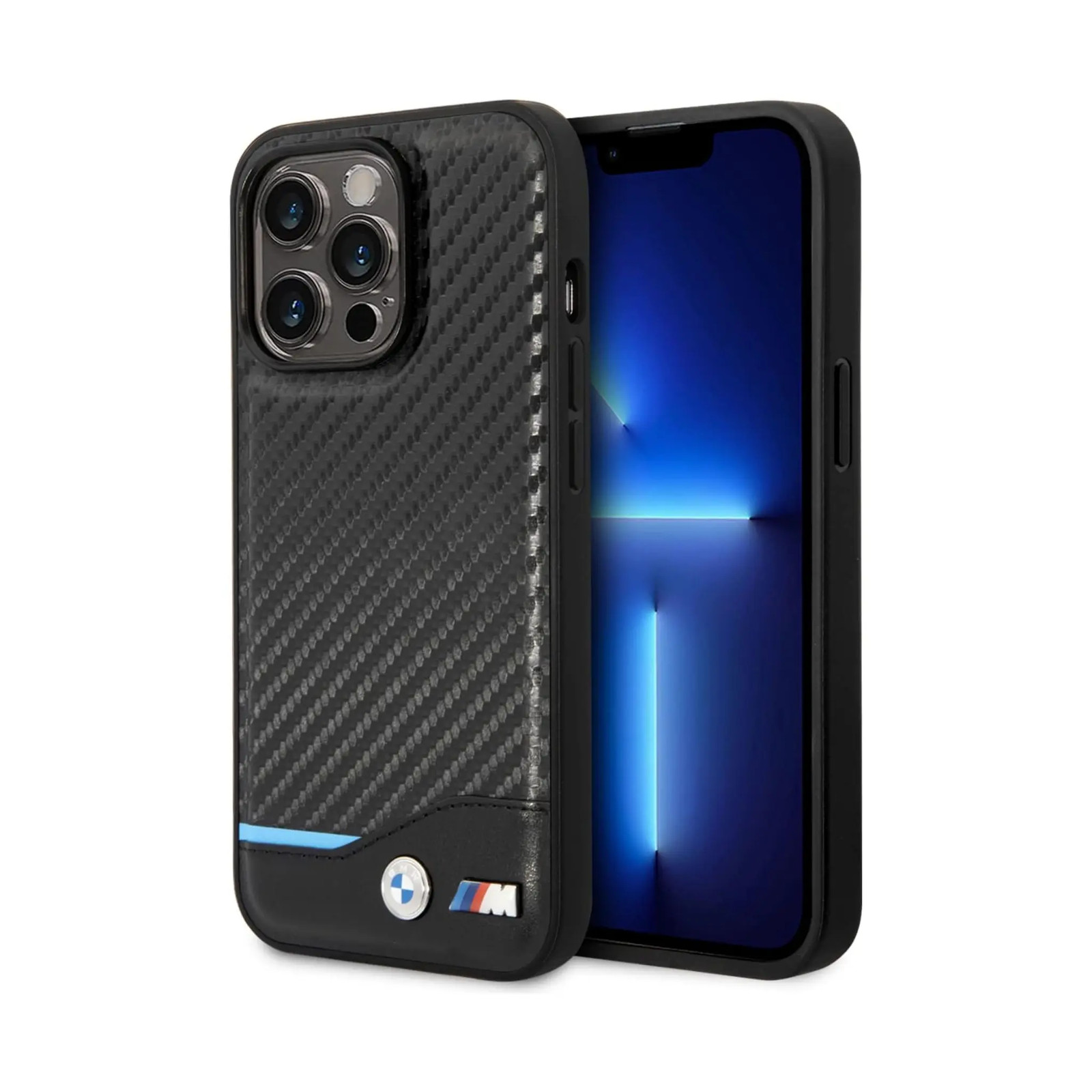 BMW iPhone 14 Pro Max Hülle, Schwarz – M Polyurethan Carbon Blue Line