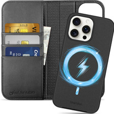 Echtleder Hülle für iPhone 15, abnehmbar, mit Kartenfach, Schwarz