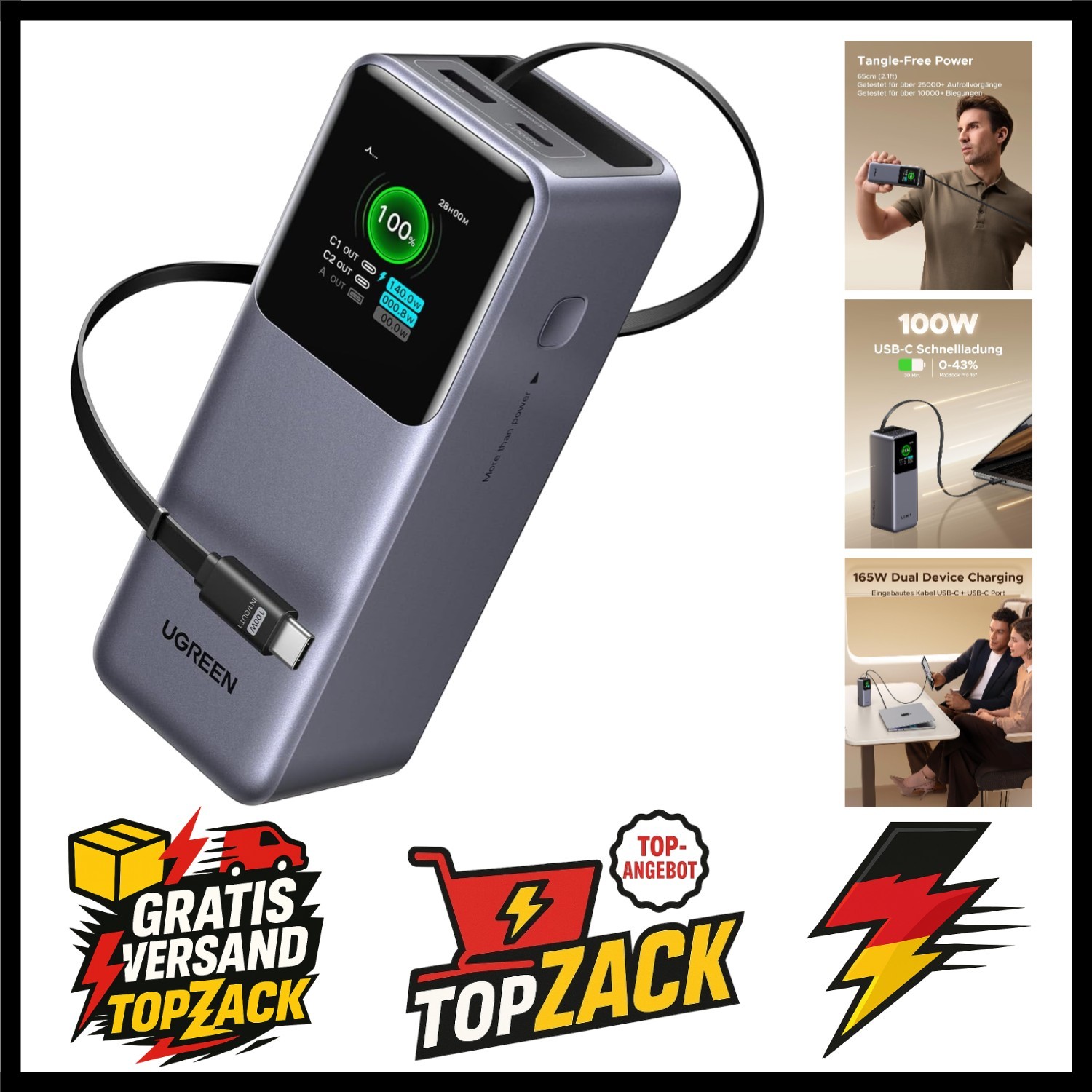 Nexode Power Bank 20000mAh, 165W Schnellladen, 65cm einziehbares Kabel, Kompa...