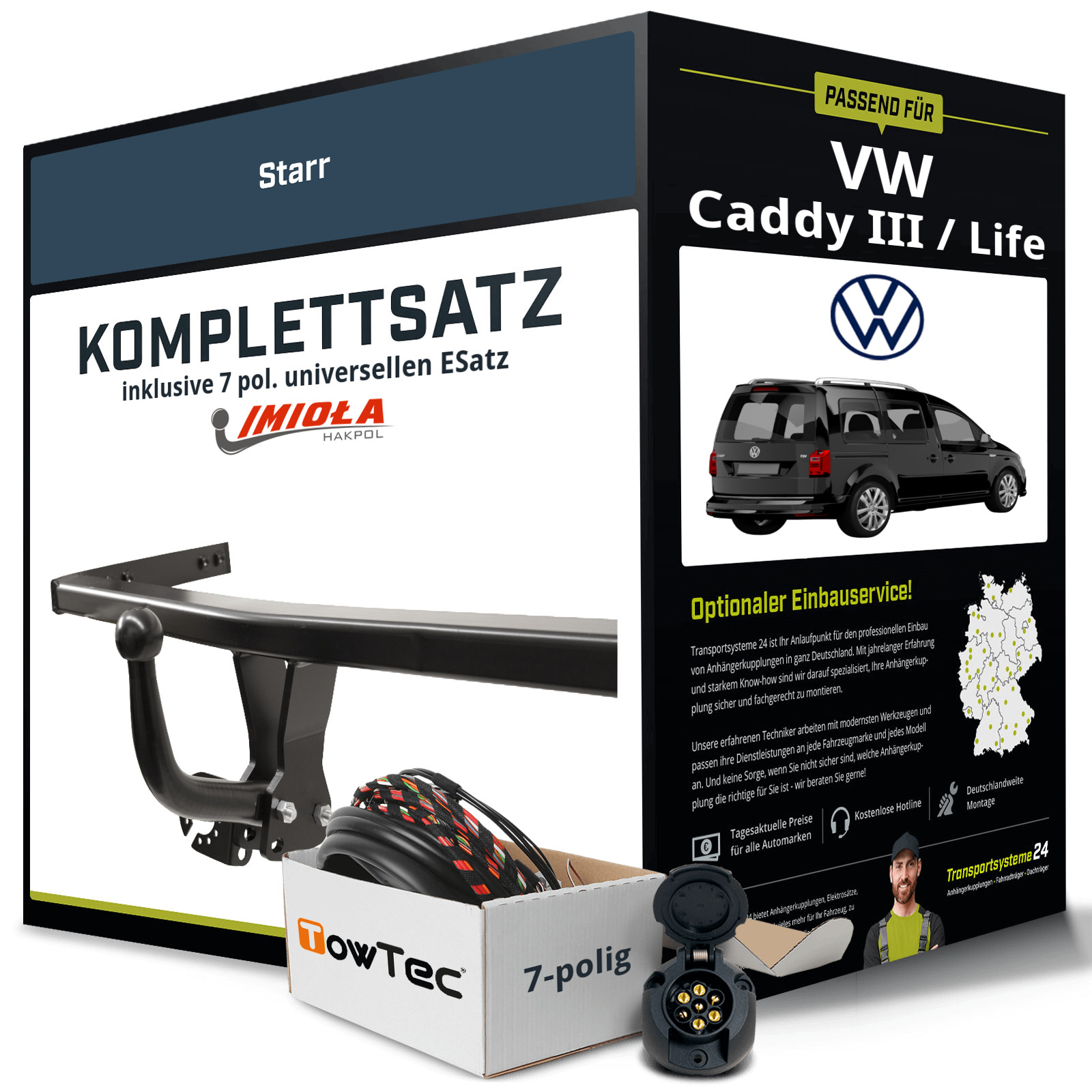 KOMPLETTSATZ für VW Caddy III / Life 03.2004 - 04.2015, bestehend aus Anhängerkupplung starr von Imiola Hak-Pol und Elektrosatz 7-polig universell von TowTec. Wichtige Informationen und Einbauanleitungen - bitte Link klicken!.