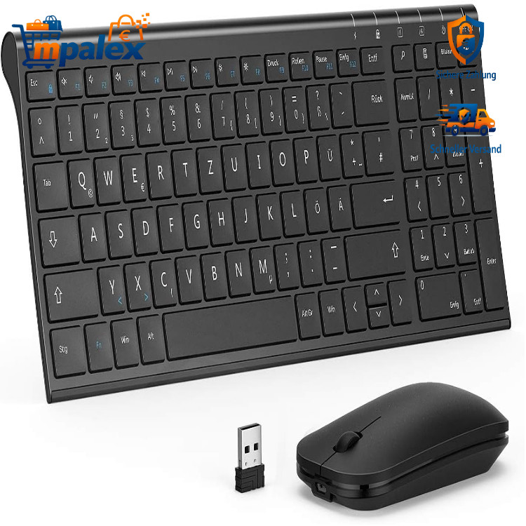 Die seenda WGJP-031B Tastatur Maus Set Kabellos Wiederaufladbare ist eine kompakte und leistungsstarke Lösung für den täglichen PC-Betrieb. 1x Tastatur, 1x Maus, 1x Micro-USB-Ladekabel. Aluminiumbasis und ABS-Tasten für Robustheit und Langlebigkeit.