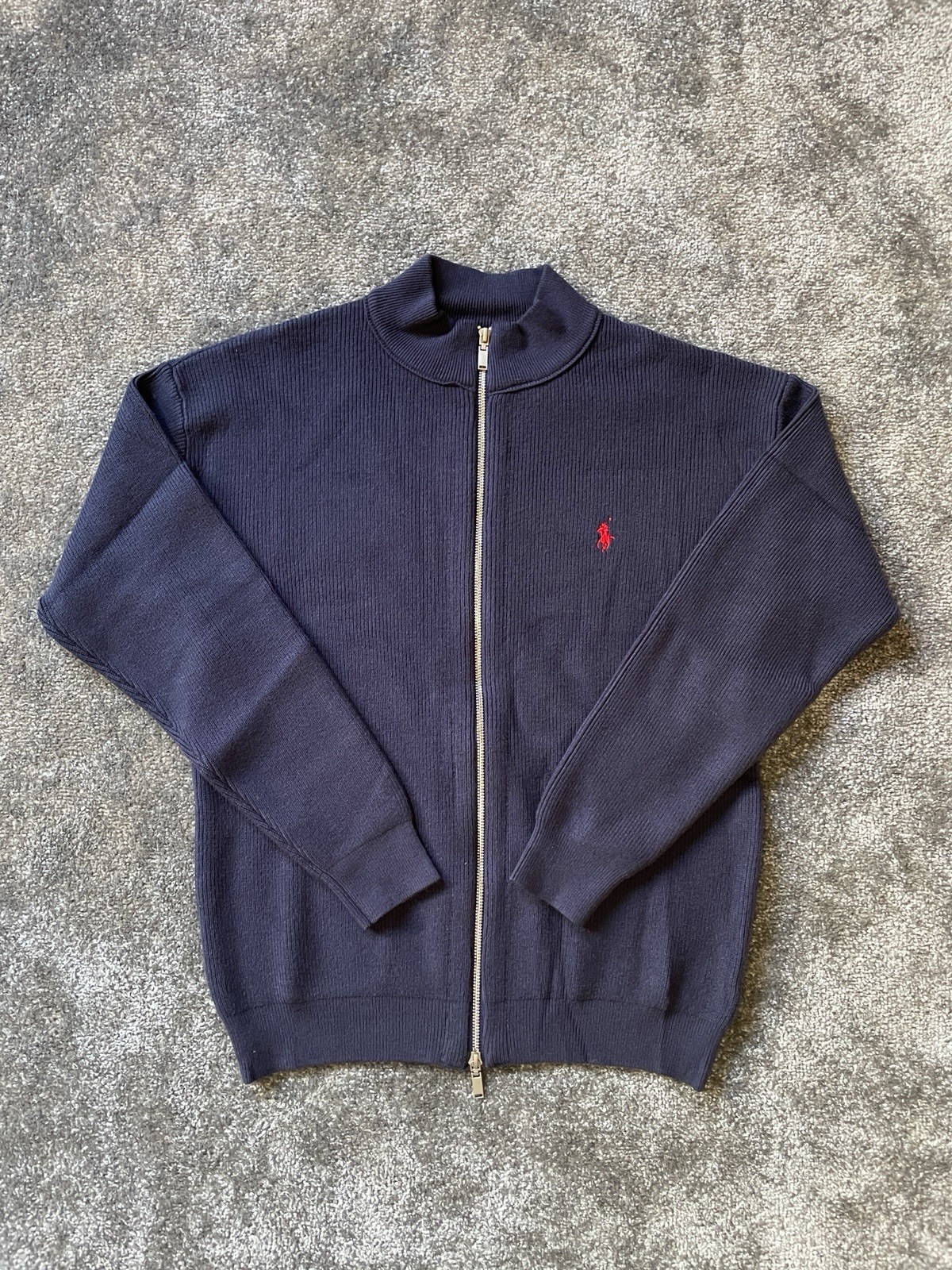 Schöne Polo Ralph Lauren Strickjacke in Dunkelblau mit durchgehendem Reißverschluss und kleinem roten Polo-Logo auf der Brust. Klassischer, zeitloser Look mit Stehkragen – passt zu vielen Outfits. • Marke: Polo Ralph Lauren • Größe: M • Farbe: Navy / Dunkelblau • Modell: Strickjacke mit Reißverschluss (Full Zip) • Stehkragen • Zustand: Sehr guter Zustand, keine Löcher oder Flecken Perfekt für Herbst und Winter oder als leichte Jacke für den Alltag. Lässt sich super mit Jeans, Chinos oder über einem T-Shirt/Hemd tragen.