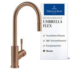 Villeroy und Boch Küchenarmatur Umbrella Flex 92540005Material Kartusche KunststoffKeramikSchwenkbereich 360°Öffnungswinkel des Hebels 25°Montage der Armatur direkt vor einer Wand möglichda die Kalt- und Warmwasserregulierung um 90° in Richtung Küchenspüle erfolgtBrauseschlauch integriertLänge 180 cm